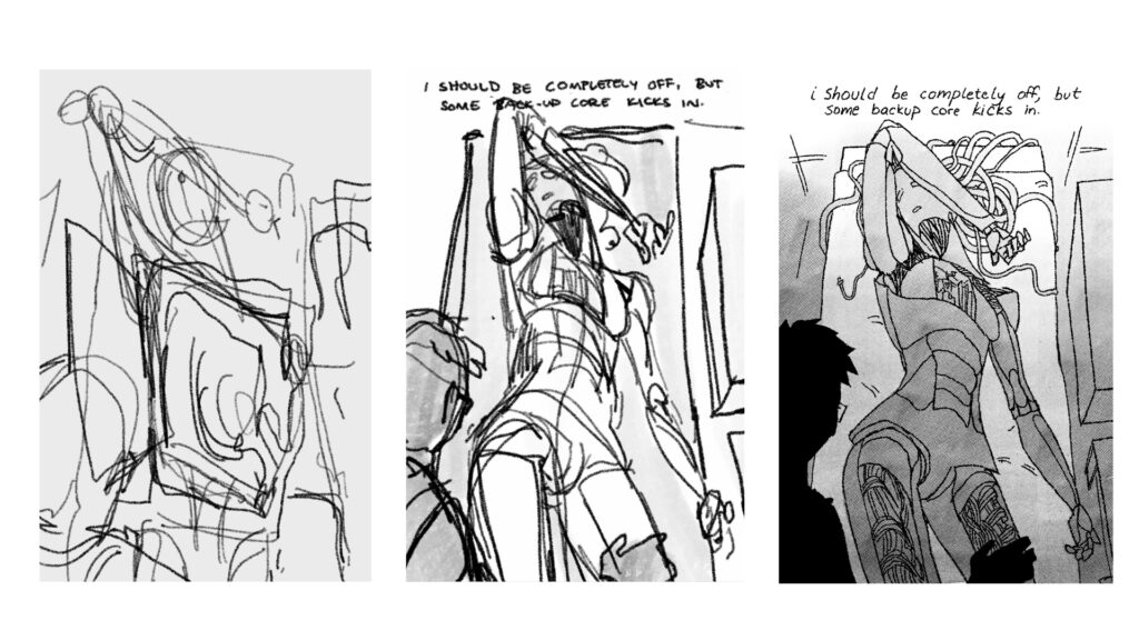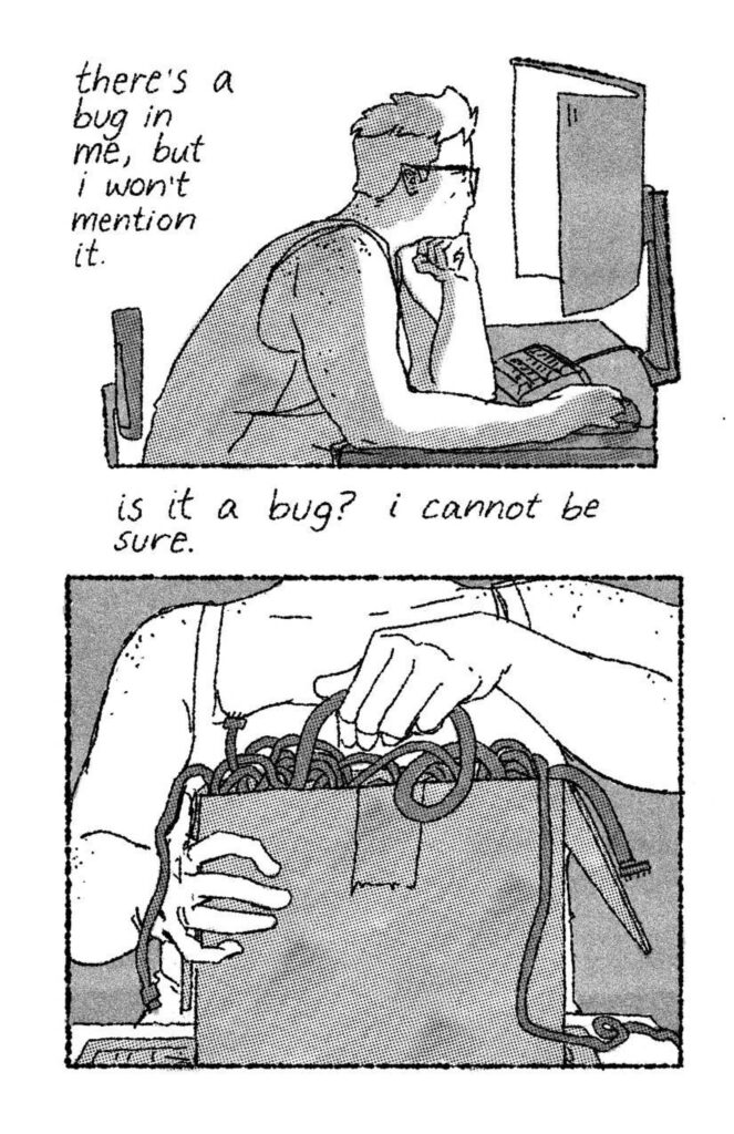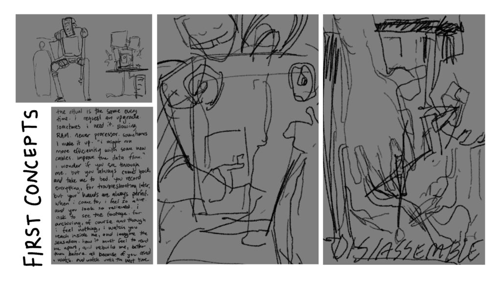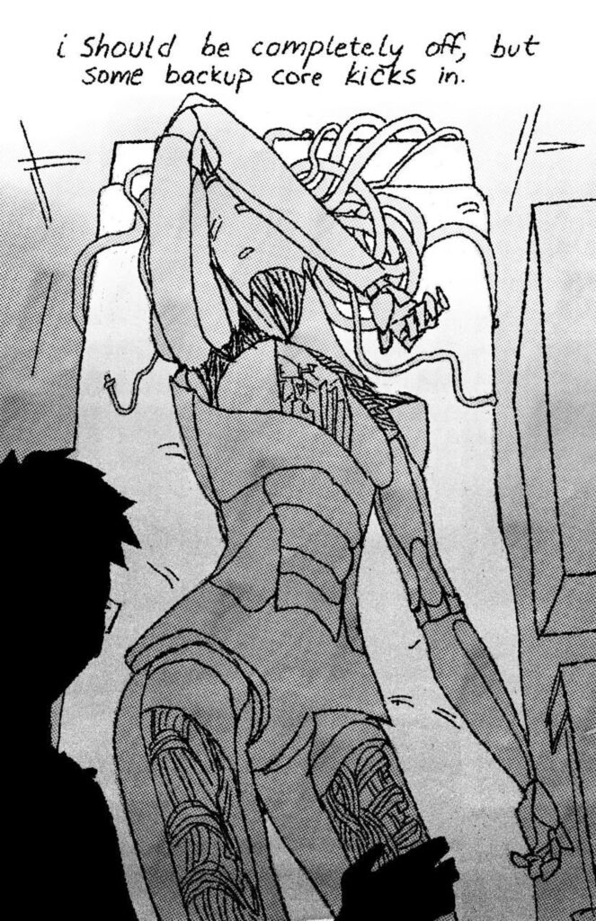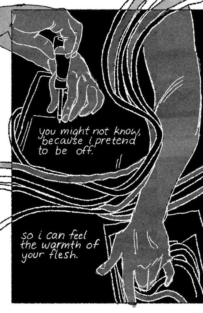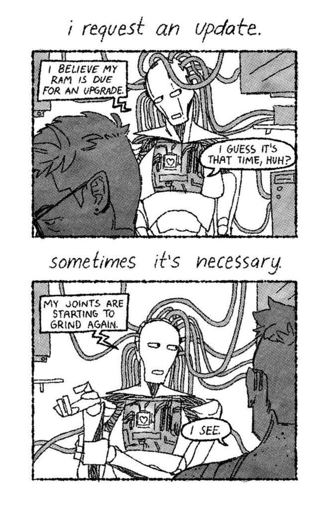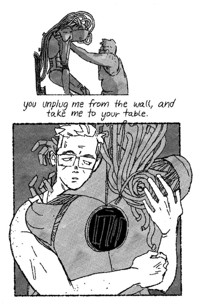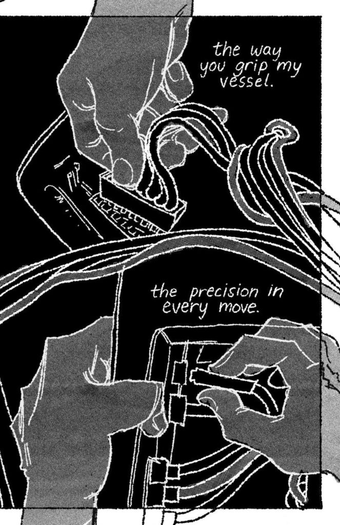 bravely asks the question: “what if a robot liked it (in a sexual way) when their creator performed upkeep on them and they were both girls???”. butch robot scientist 4 femme robot. lots of wires + hand stuff. originally created for + printed as WBMC‘s april 2024 comic.