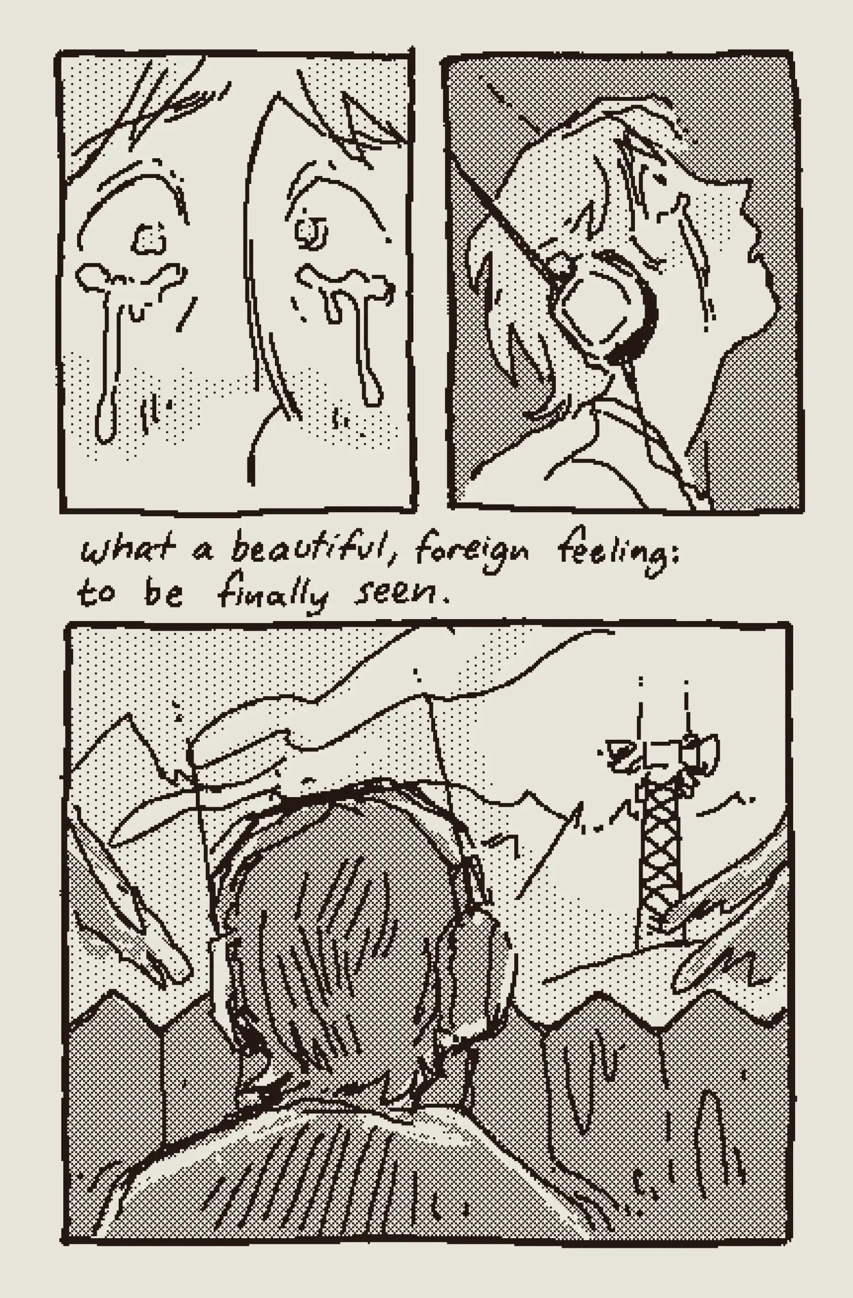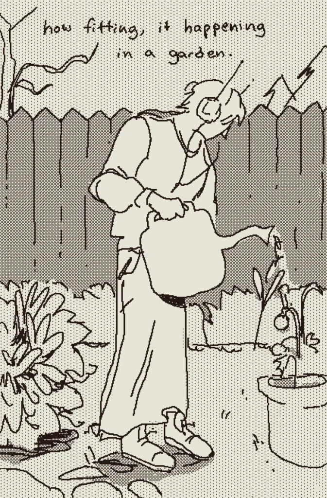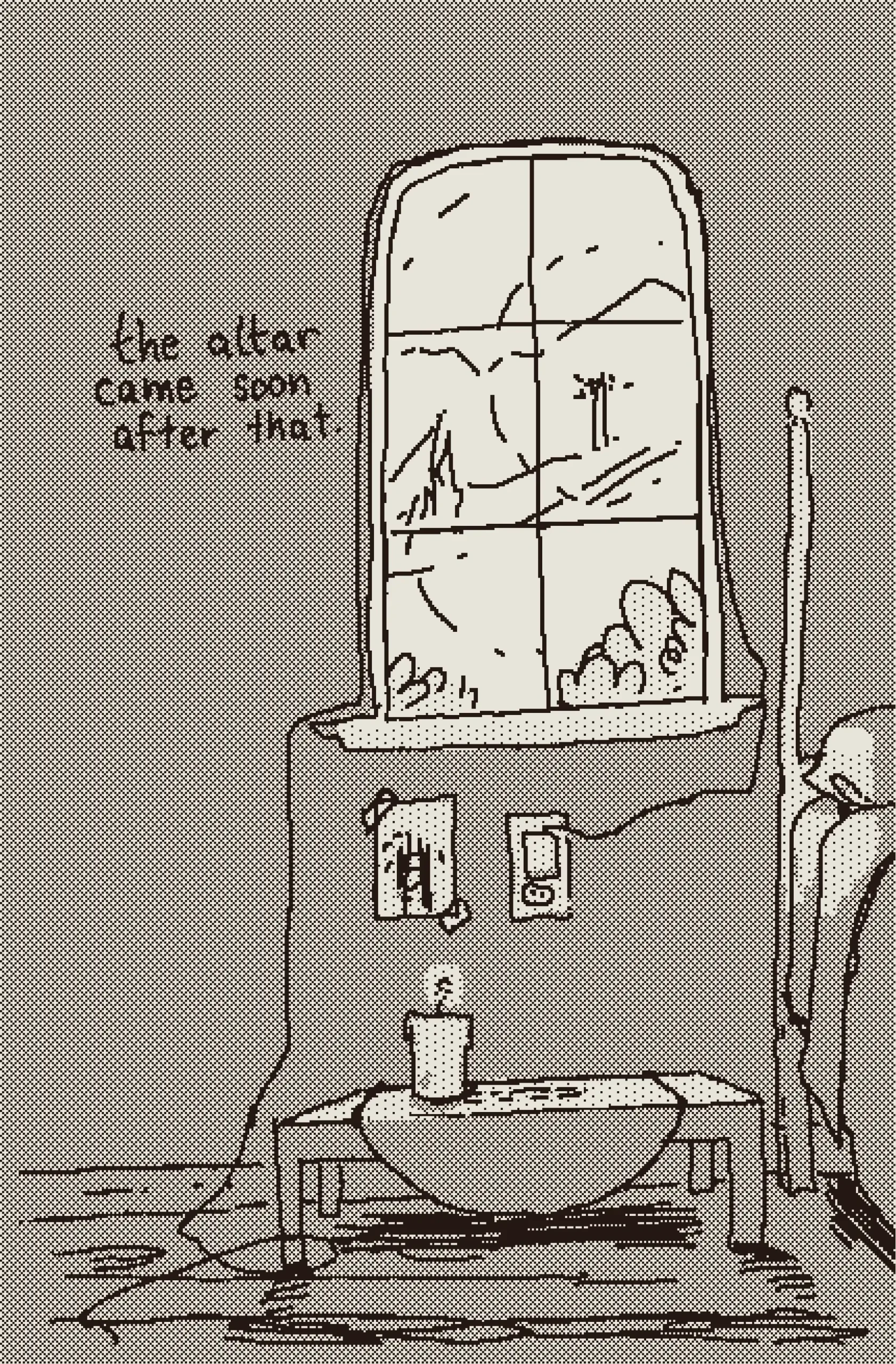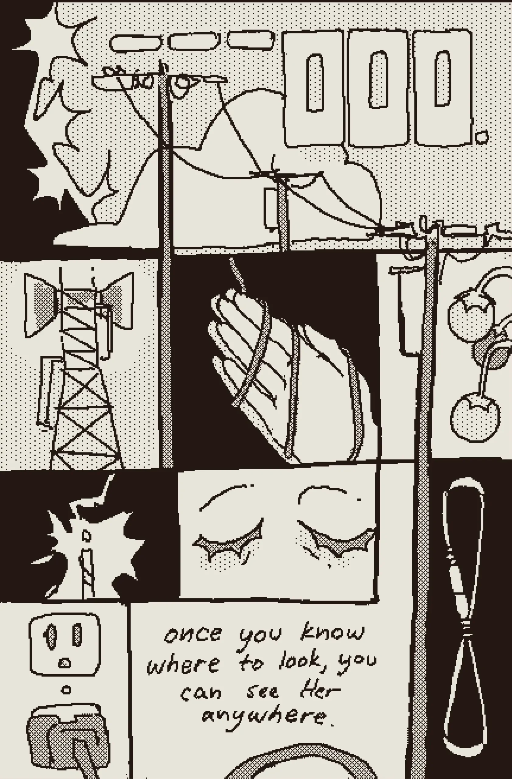 a girl begins to worship the radio tower by her house after she begins to hear the word of god through electric currents. a loose joan of arc sort of thing. originally published in the 2022 shortbox comics fair.